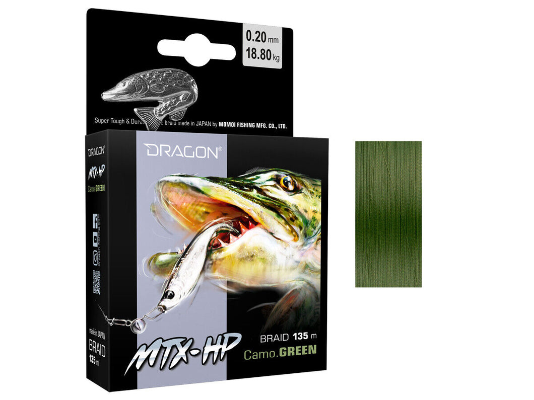 Extremely strong and durable HPPE fiber braids made in Japan by MOMOI FISHING MFG. CO.,LTD. Professional lines for advanced method anglers spinning and casting. MTX-HP CAMO GREEN ❖ Covered with a protective coating. ❖ Protected against UV rays. ❖ Zero stretch. ❖ Without shape memory. ❖ Reduced friction on the guides. ❖ Very resistant to abrasion. ❖ Round and soft. ❖ Available in three colors. ❖ Recommended for use with Dragon rods Millennium MTX.