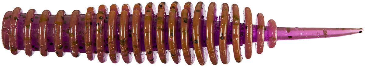 Imitation of a worm with a large ribbed tail, which vibrates very realistically thanks to the large number of segments. A special feature of this bait is that its deeply ribbed body stops air bubbles and rises almost vertically upwards when the bait is left on the bottom. The most effective way to rig Snack is a cheburashka with a round or offset hook. You can also use a suitably short double treble hook, preferably made of not too thick wire, so as not to disturb the natural action of the bait. The front part of the rubber is wide enough to minimize the risk of damaging the body when rigging with a double treble hook, and also facilitates rigging with a screw. The main species of fish caught on Snack are perch and pike-perch of various sizes. Therefore, you should not forget about such sets as drop-shot and Carolina rig. There is a special groove in the body of the bait, which allows you to hide the blade of the offset hook when fishing in difficult, catching places.